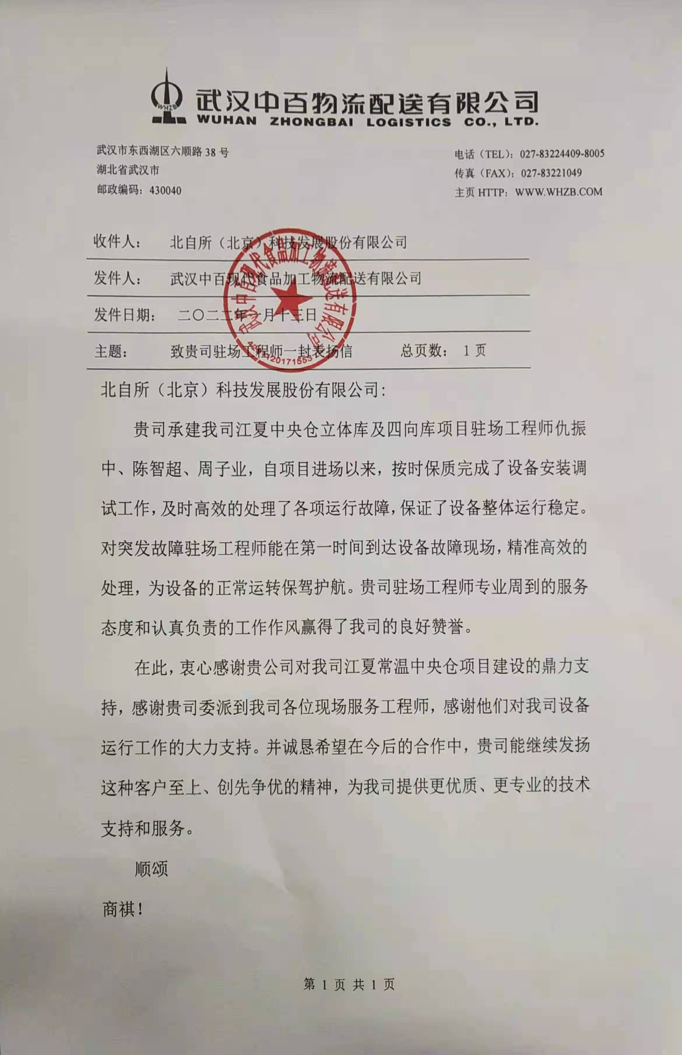 一封來自中百物流的表揚信