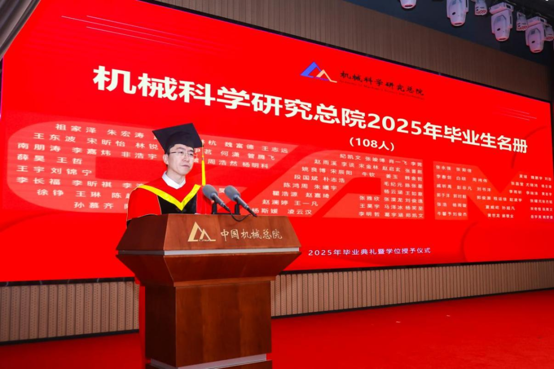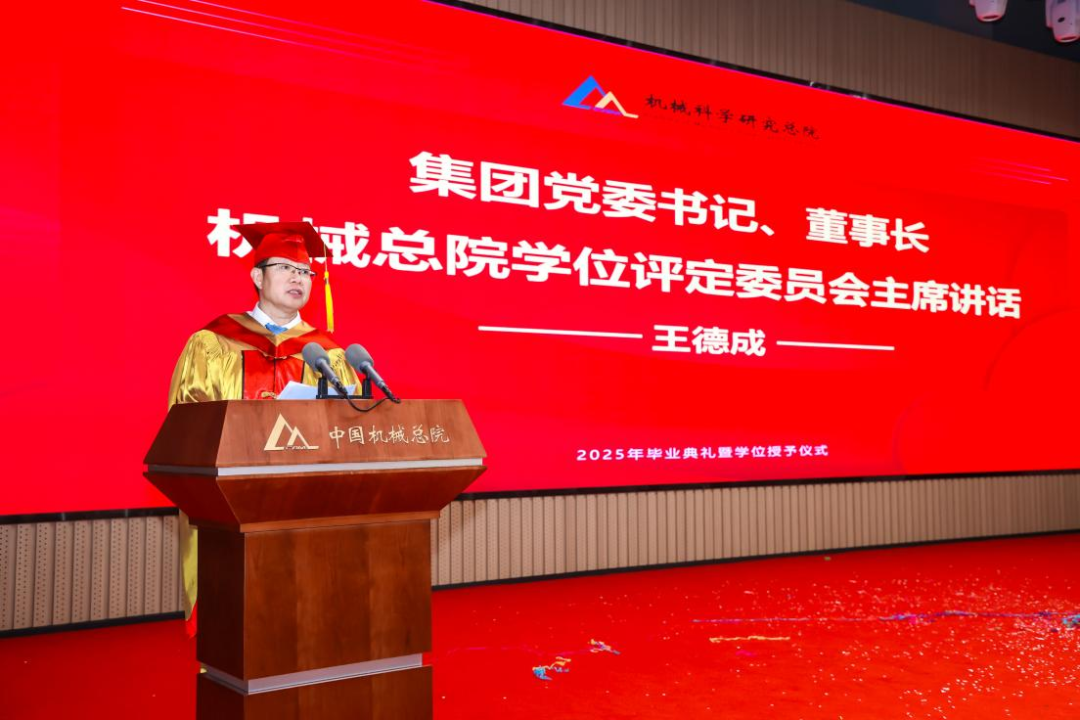 機械總院學位評定委員會主席、集團黨委書記、董事長王德成,集團黨委副書記、總經(jīng)理孟祥宇,集團黨委副書記、董事李玉鑫,集團黨委委員、副總經(jīng)理王宇,機械總院學位評定委員會副主席、集團副總經(jīng)理李愛國,集團副總經(jīng)理姜超出席典禮,機械總院學位評定委員會委員、京內(nèi)外各二級單位領(lǐng)導(dǎo)、導(dǎo)師代表、研究生管理部門負責人、2025屆畢業(yè)生及家屬共計190余人齊聚一堂,共同見證這一重要時刻。典禮由機械總院學位評定委員會秘書長、研究生院副院長邊翊主持。