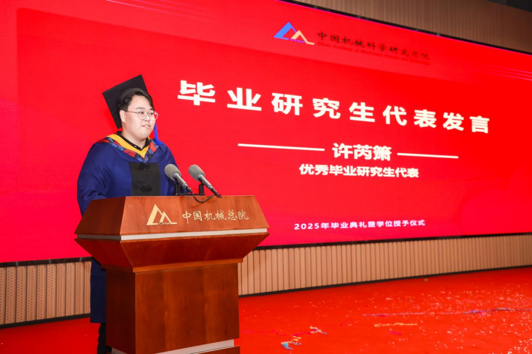 李愛國宣讀了《機械科學研究總院2025屆畢業(yè)生學位授予決定》,王德成為每位畢業(yè)生撥穗正冠并頒發(fā)學位證書。